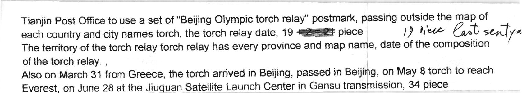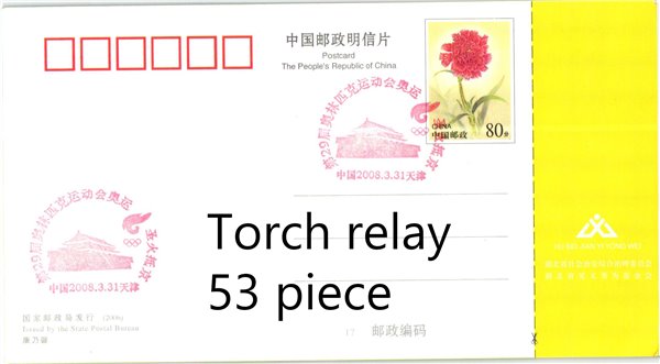 Also on March 31 from Greece the torch arrived in Beijing, passed Beijing, on May 8 torch to reach Everest, on June 28 at the Jiuquan Satellite Launch Center in Gansu trasmission, 34 piece.