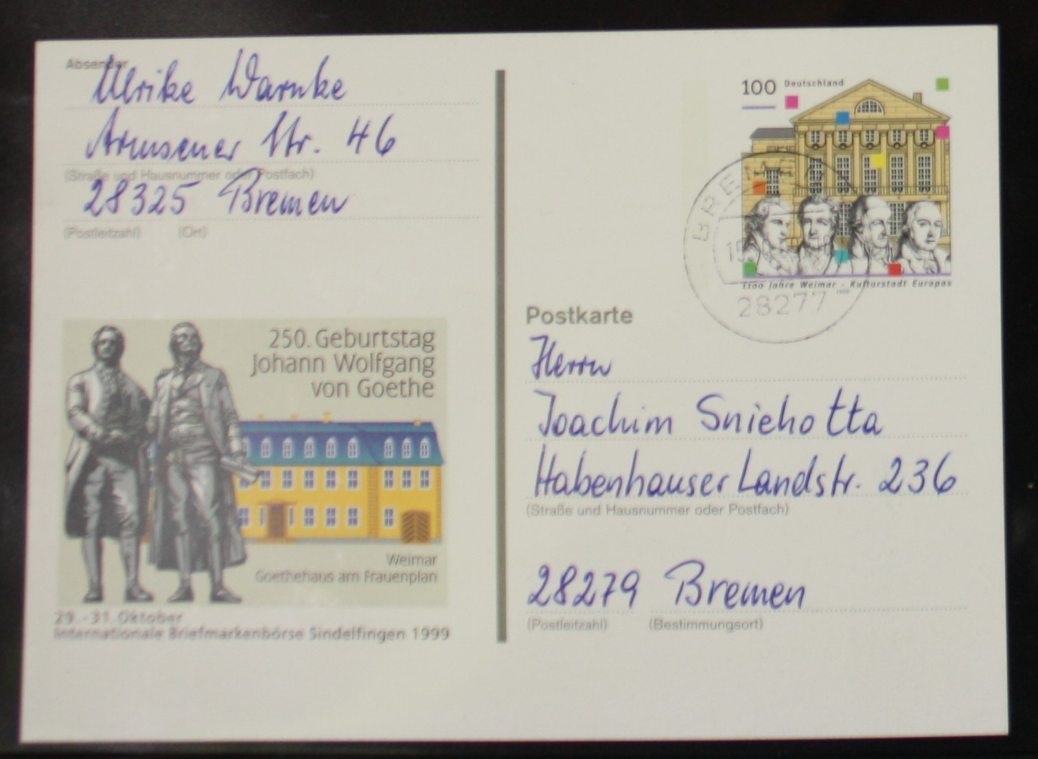 Deutschland PSo 62 Weimar 1999 Geburtstag Goethe TST Bremen