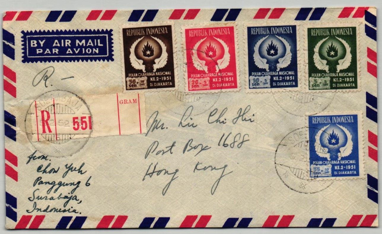 Indonesien Djakarta 1951 Nr. 89 – 93 Reko Lustpost / Airmail nach Hong Kong, Nationales Sportfest
