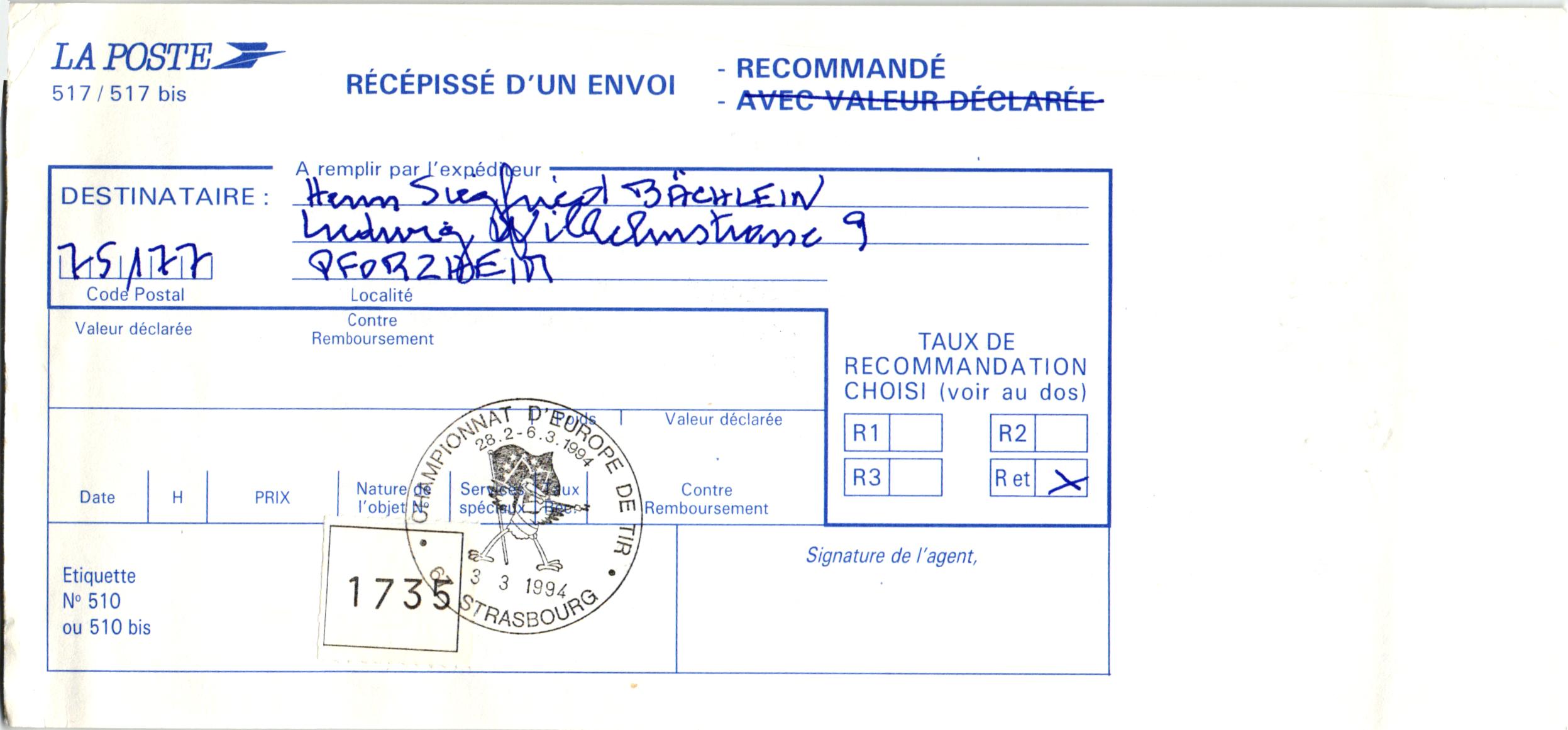 Shooting, Schiessen Championnat Europe de tir Strassbourg 1994 Rifle Aufgabeschein REKO, Weapons Waffen Tiro a segno